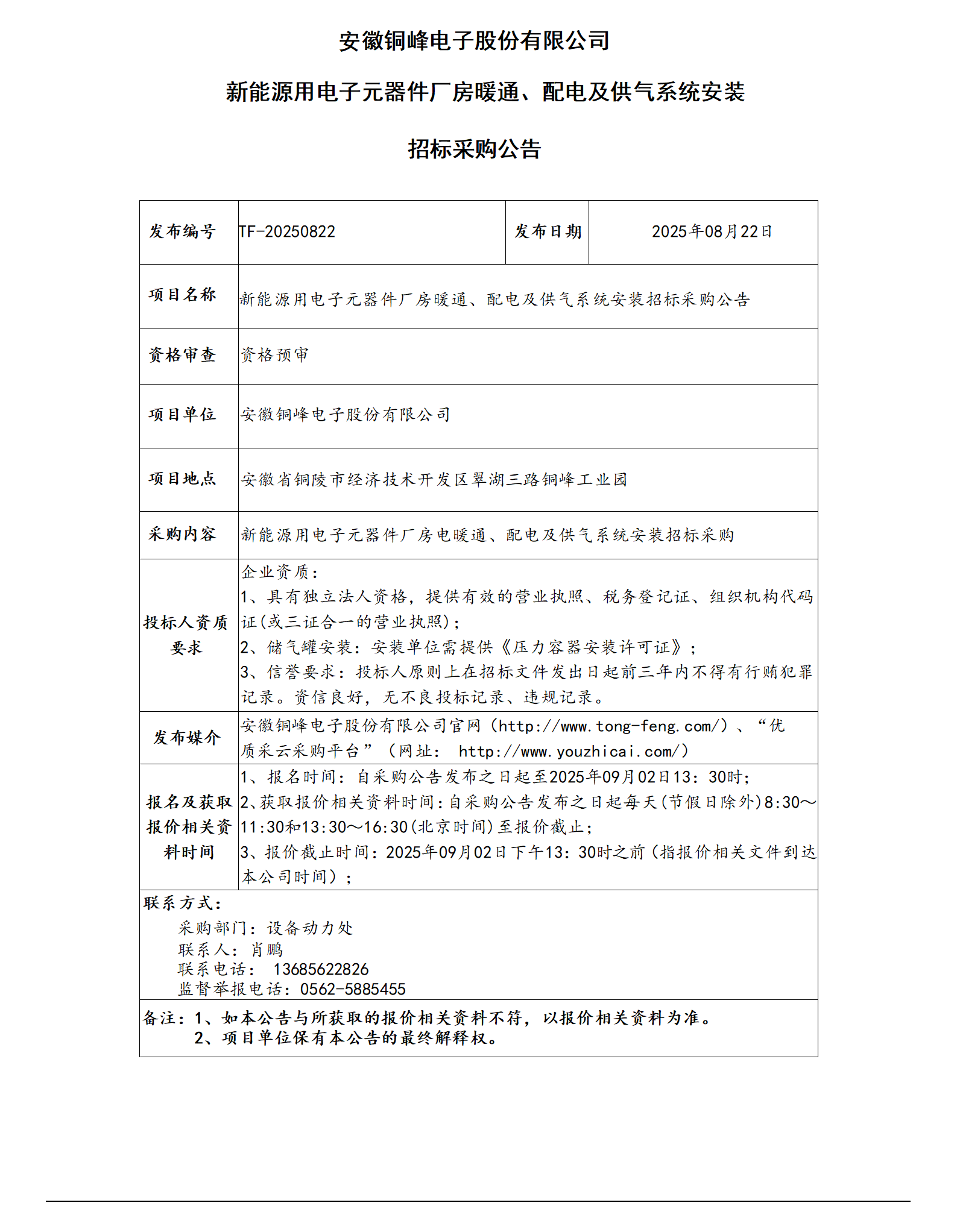 安徽銅峰電子股份有限公司 (新能源用電子元器件廠房?jī)艋こ?招標(biāo)公告)_01